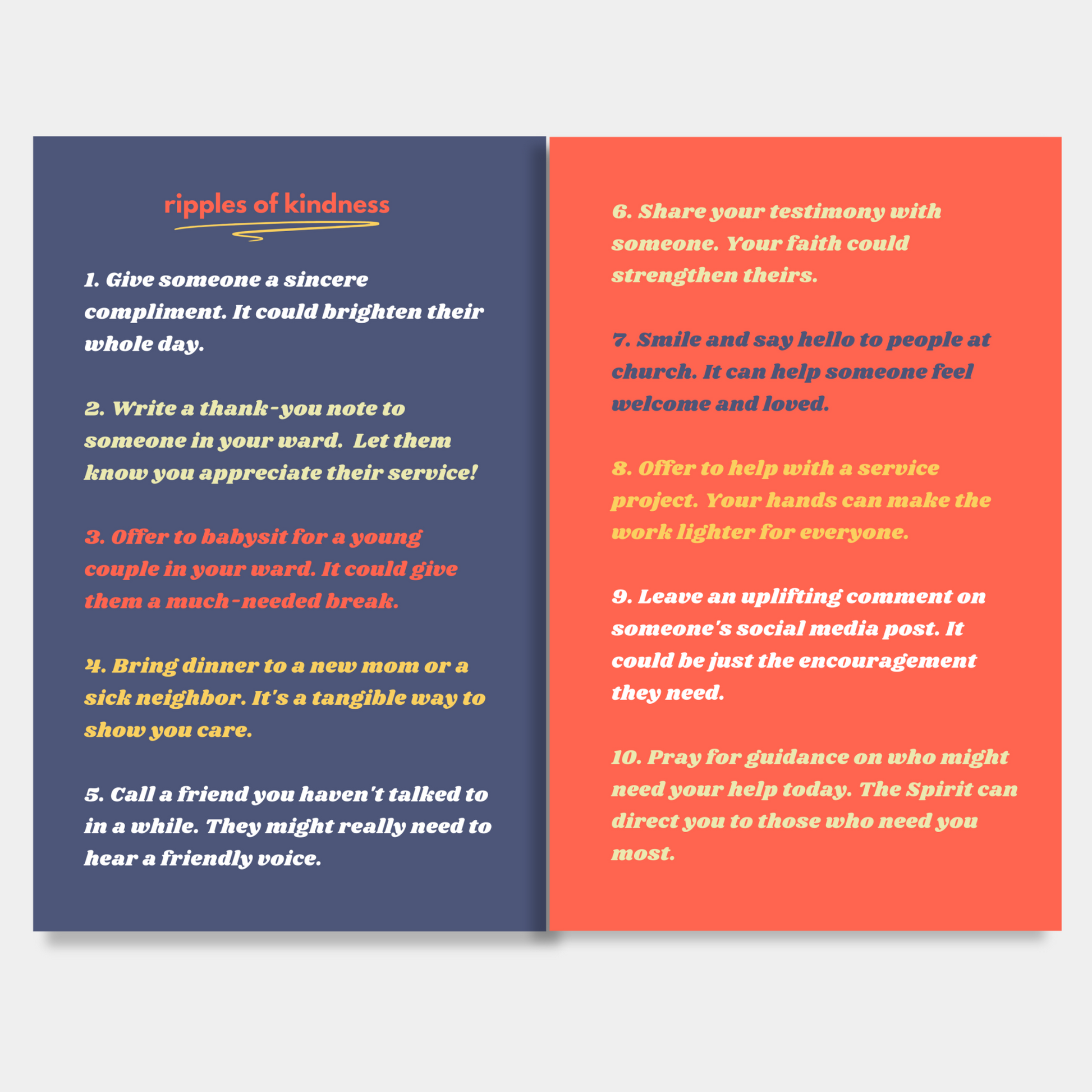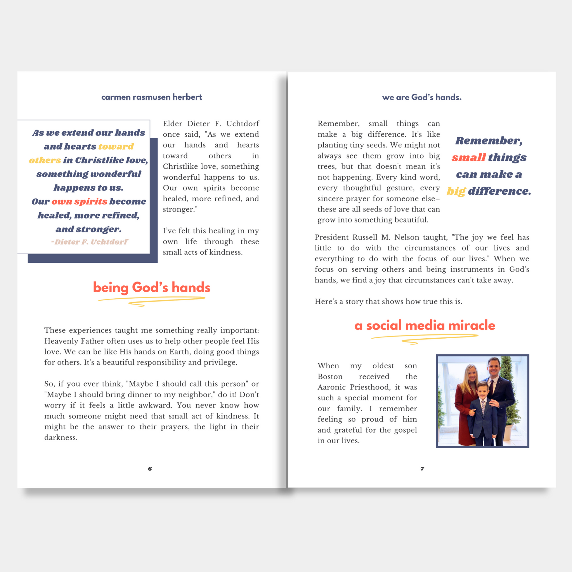 Heavenly Father often uses us to help other people feel His love. We can be like His hands on Earth, doing good things for others. It's a beautiful responsibility and privilege. The Lord needs our small acts of kindness wherever we are. Like dropping a pebble in a pond, the ripples of our kind actions can spread far beyond what we can see. The world is waiting for your light. Shine bright, and watch how the Lord magnifies your efforts beyond anything you could imagine.