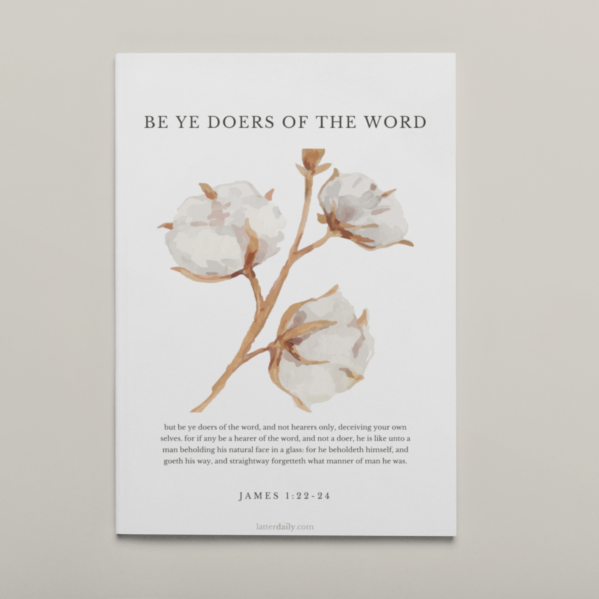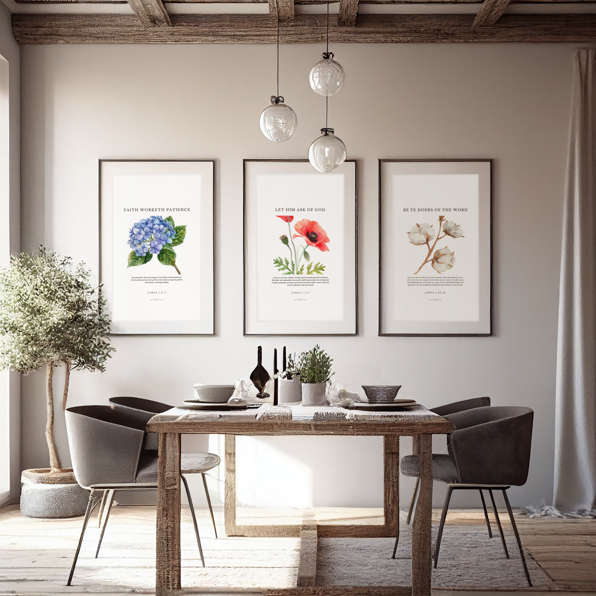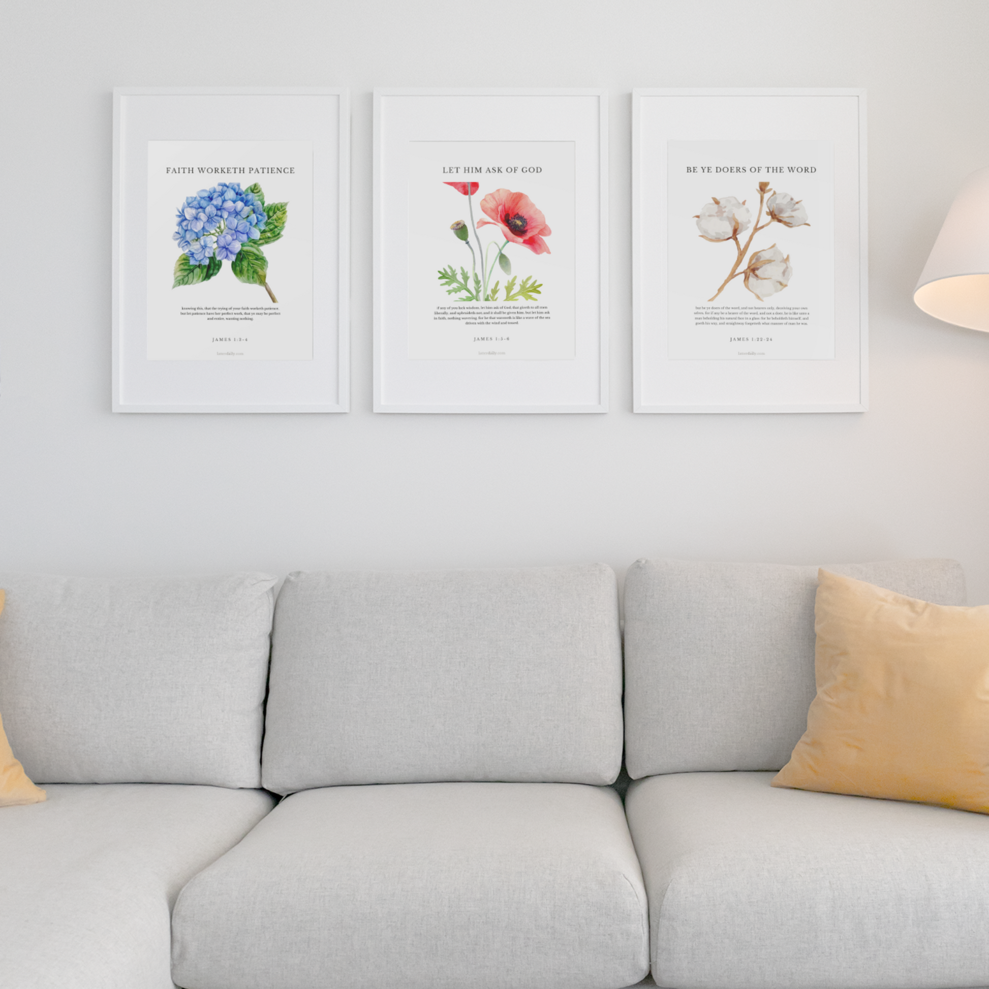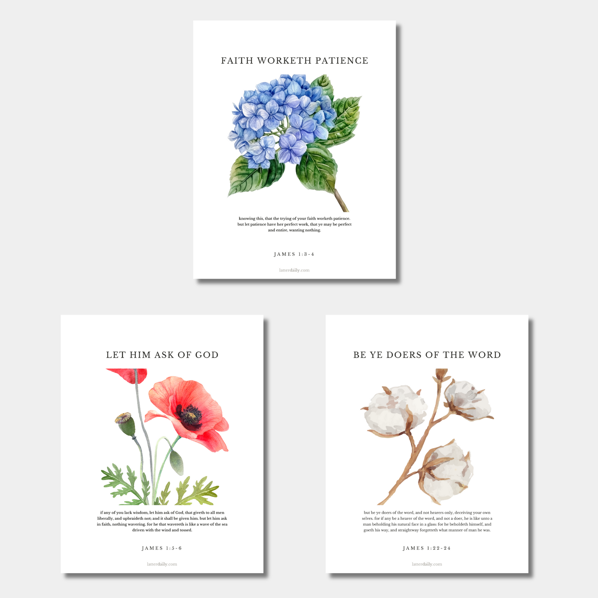 Our latest floral print gently brings to life some of the most powerful and reflective verses of James 1. Featuring phrases like “the trying of your faith worketh patience” and “if any of you lack wisdom, let him ask of God,” these designs are perfect for those seeking quiet strength, divine guidance, and a reminder to be “doers of the word, and not hearers only.” Thoughtfully created for personal study, home decor, or church use, they invite deeper connection with the scriptures.