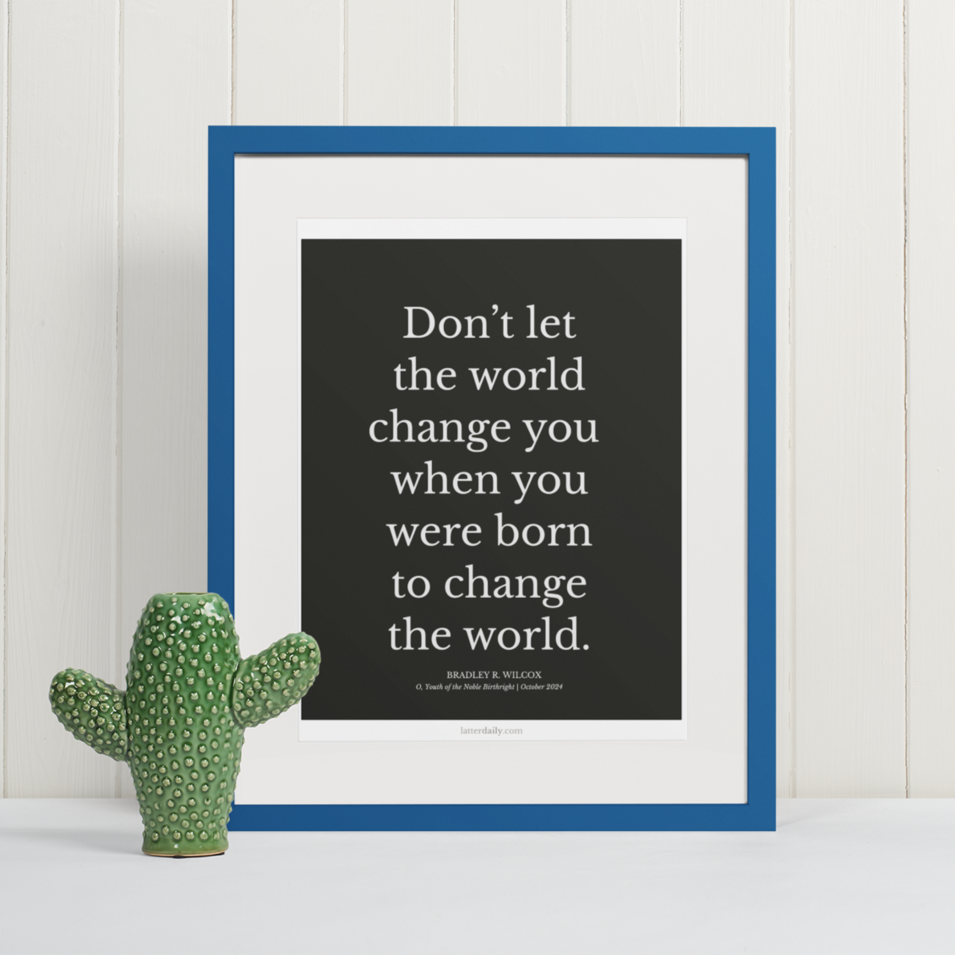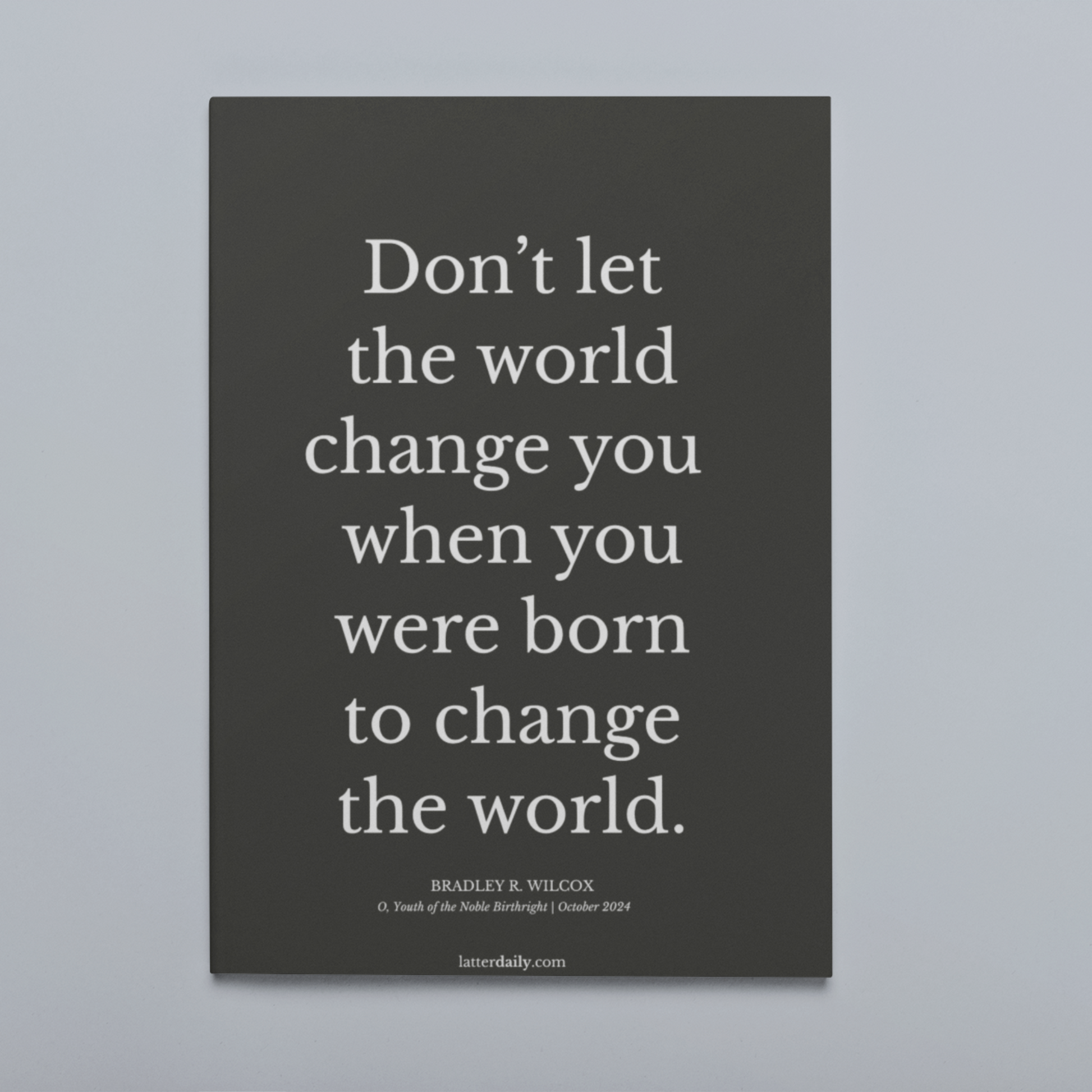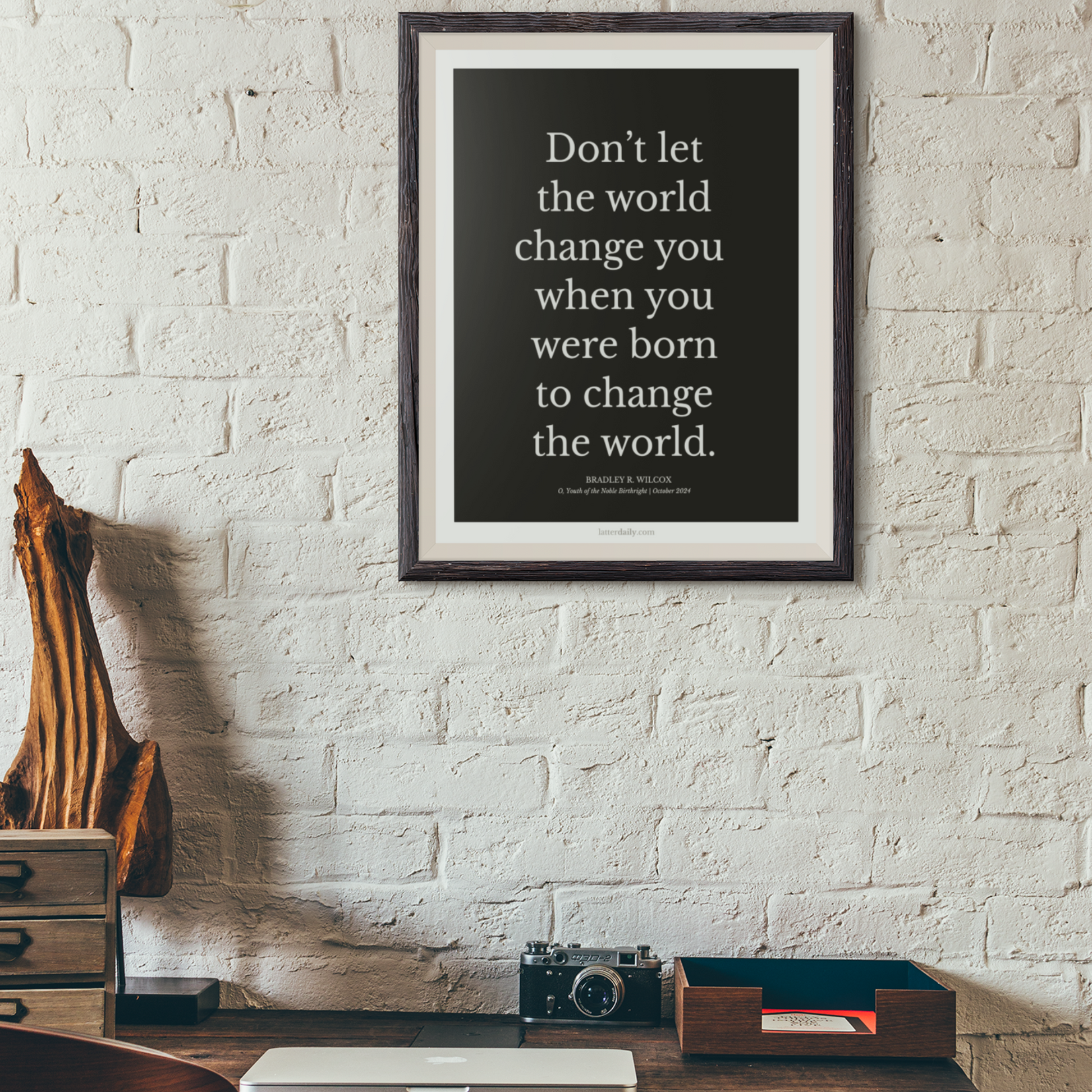 This bold and inspiring printable features the empowering quote by Bradley R. Wilcox: “Don’t let the world change you when you were born to change the world.” It’s a perfect reminder for youth, missionaries, or anyone striving to live with purpose and courage in a shifting world. Designed for easy display, it’s great for personal spaces, classrooms, or church settings.