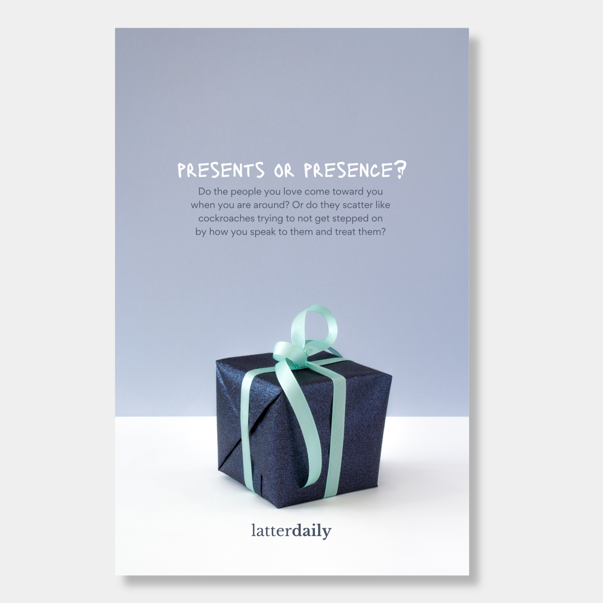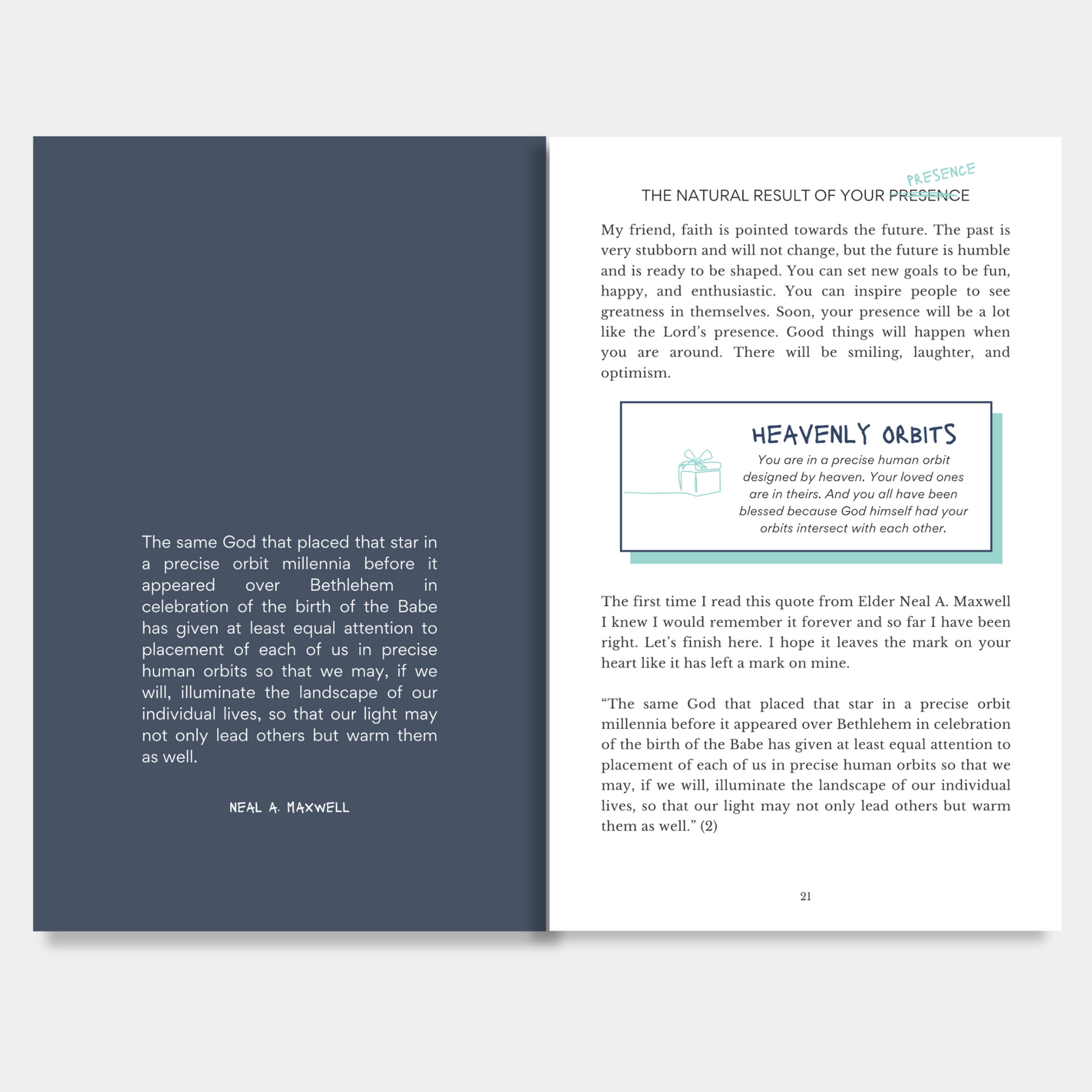 What happens when you are in the room? Do people smile? Do they go quiet and cower? Does your attitude make people warmer or does it make them colder? Are people drawn toward you or do they scatter like cockroaches trying not to get stepped on by how you speak to them? You are in a precise orbit designed by heaven. Your loved ones are in theirs. And you all have been blessed because God himself had your orbits intersect with each other. You might take a step back and evaluate just how much your presence affects others as you realize that God placed you in your family, your career, your school, and your circle of friends, to be a light to them and they are meant to be a light unto you. Now is the time to learn how to give them the true gift of your presence. Originally written as a Christmas book, this message applies to every moment of your everyday life.