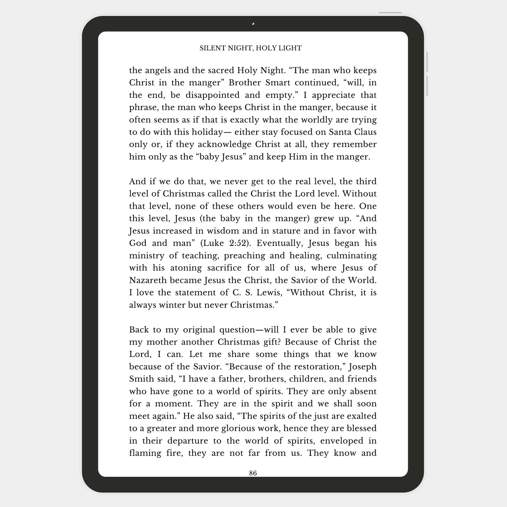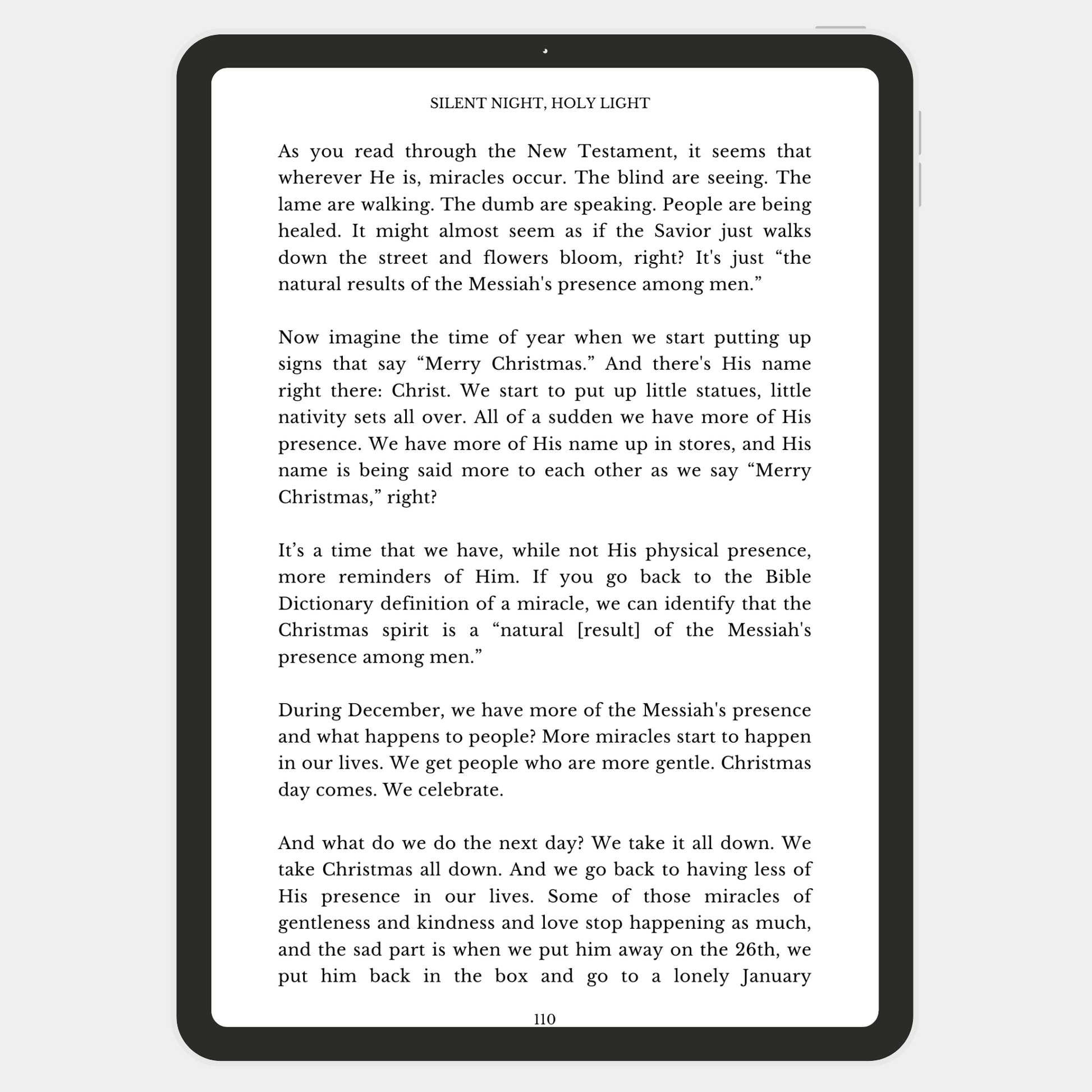 Silent Night, Holy Light is a collection of exclusive Christmas messages from best-selling authors and inspirational speakers Hank Smith, Meg Johnson, and John Bytheway. Each message will help you find Christ throughout the busyness of Christmas, and keep your focus on the Savior, the true Reason for the holiday season.