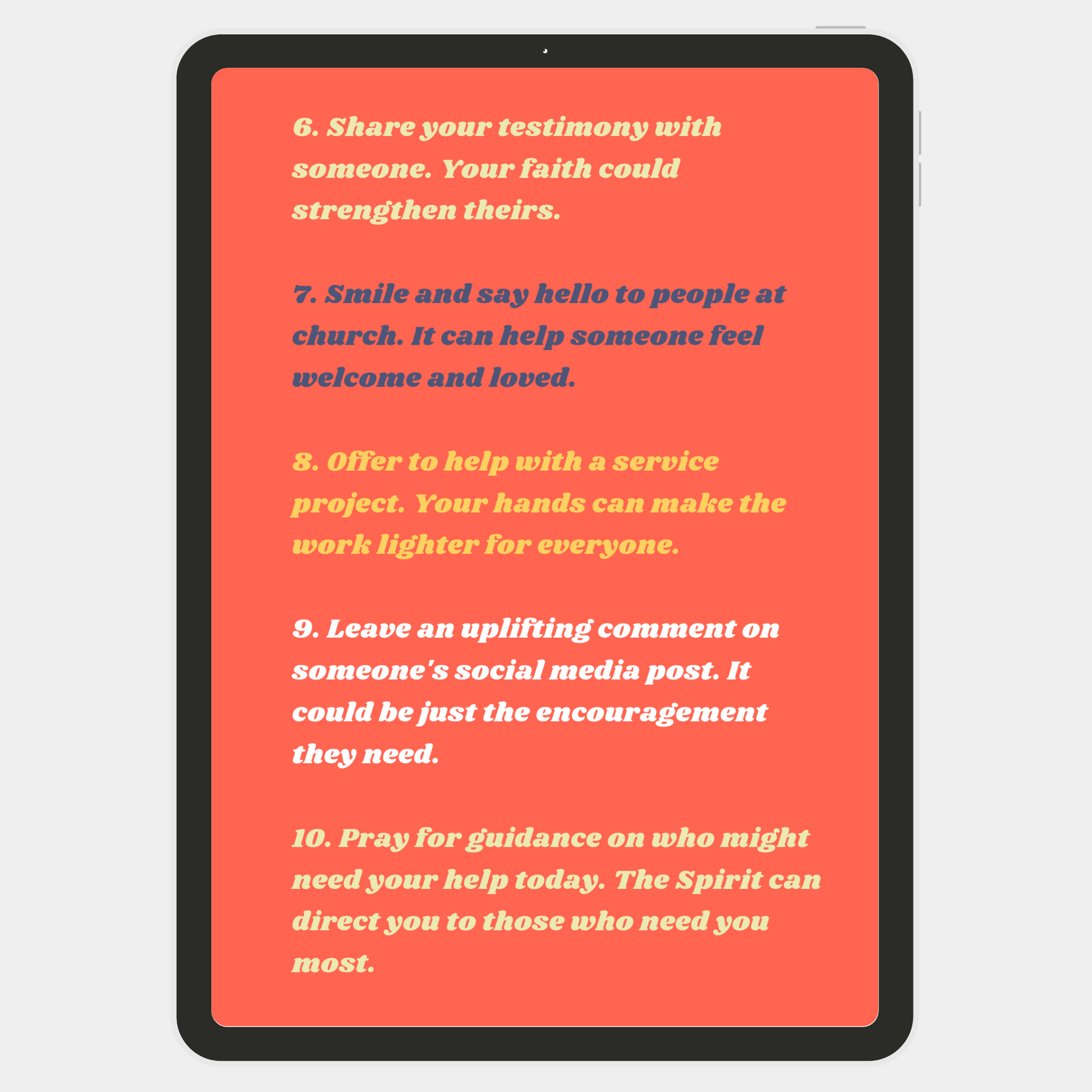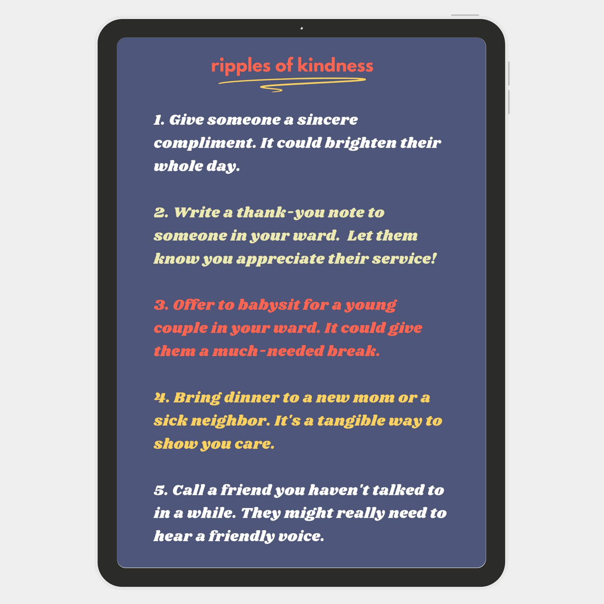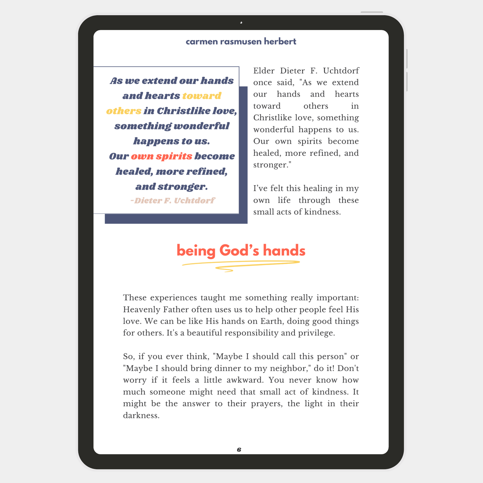Heavenly Father often uses us to help other people feel His love. We can be like His hands on Earth, doing good things for others. It's a beautiful responsibility and privilege. The Lord needs our small acts of kindness wherever we are. Like dropping a pebble in a pond, the ripples of our kind actions can spread far beyond what we can see. The world is waiting for your light. Shine bright, and watch how the Lord magnifies your efforts beyond anything you could imagine.
