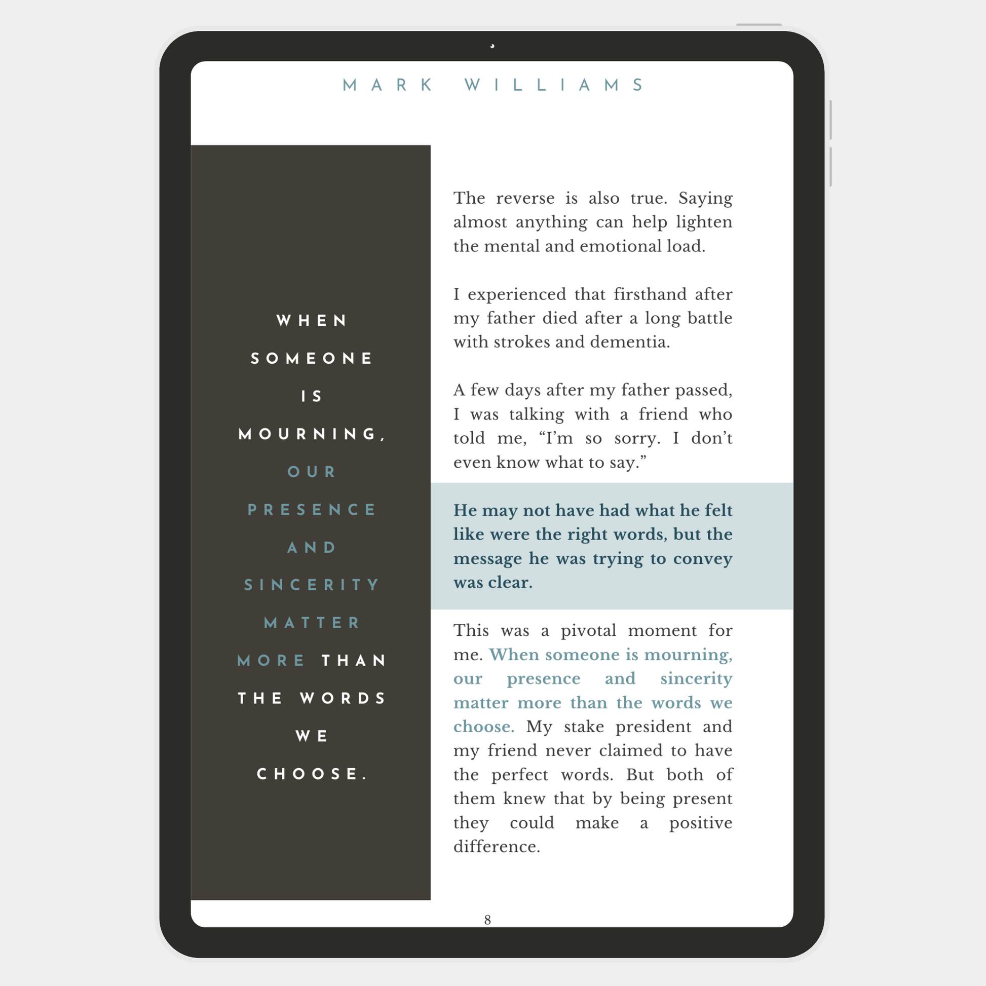 Navigating grief and the change it requires is deeply personal and often unpredictable. Grief doesn't follow a straight path. There isn't a perfect timeline or a one-size-fits-all solution for working through it. One of the hardest things in life is to watch someone you care about navigate their own pain and challenges. In those moments, what do you say? Or not say? While it can be uncomfortable, we all have the ability to make a difference for someone in grief. Whether you're the one mourning or trying to make the world brighter for those who are struggling, as you show up in simple ways, you'll be shocked at the miracles you'll become a part of.
